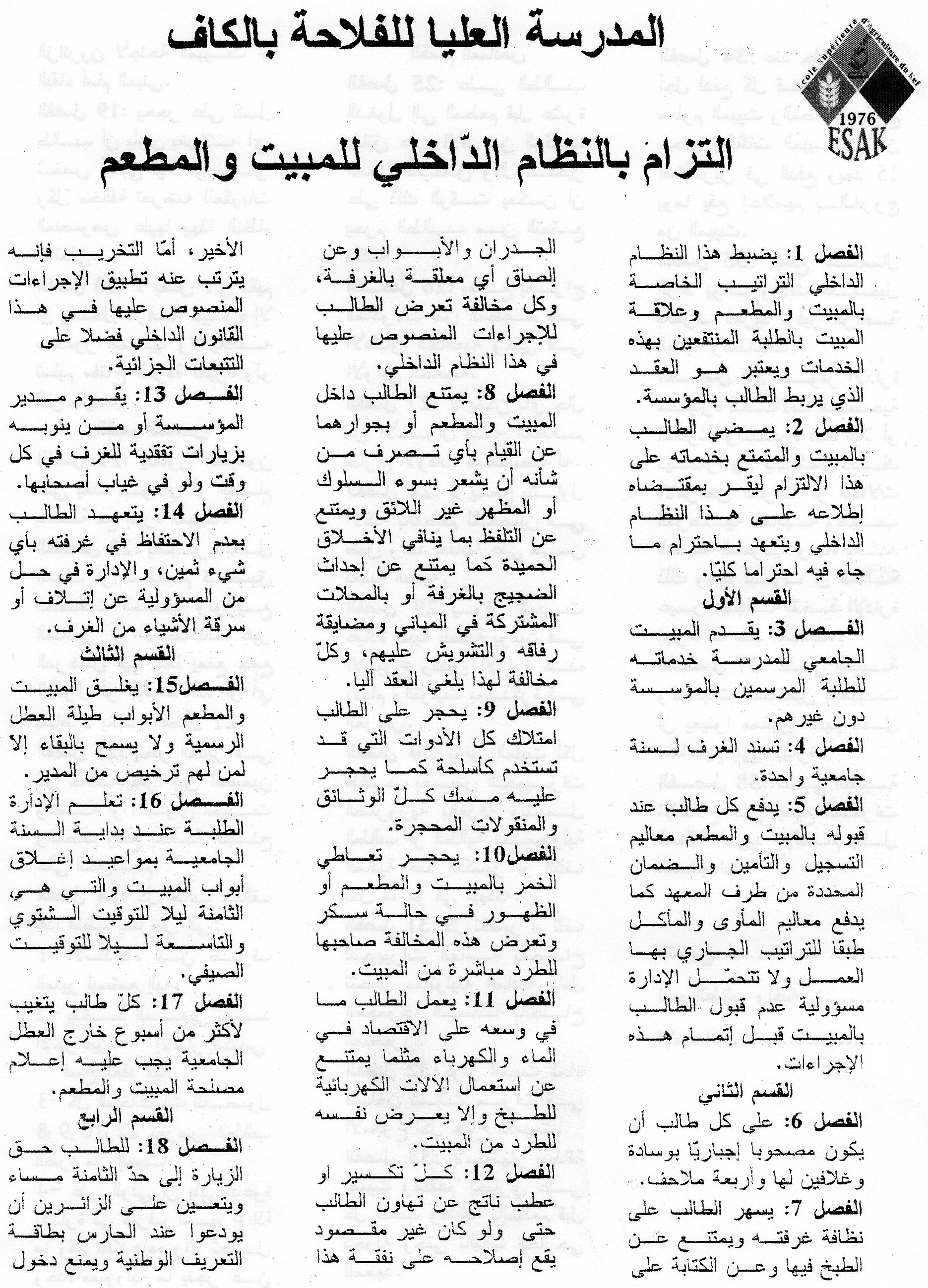 التزام بالنظام الداخلي للمبيت والمطعم الجامعي للمدرسة العليا للفلاحة بالكاف Featured